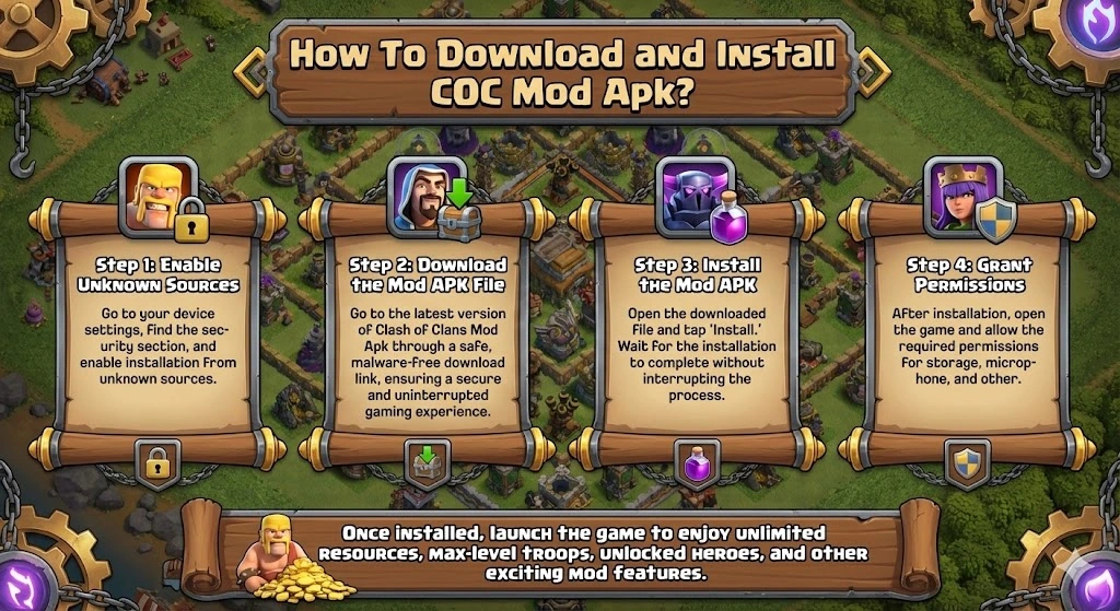 Downloading and installing Clash of Clans Mod Apk is a simple process, but it requires careful steps to ensure safety and smooth gameplay. The mod version allows access to unlimited resources, unlocked heroes, and max-level troops, but it is not available on the official app stores. Therefore, players need to follow the proper method to download it safely.