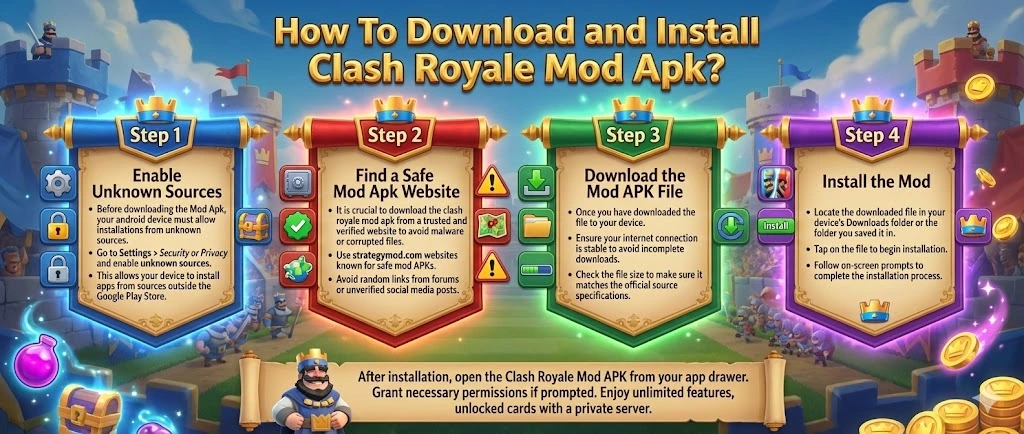 - It is crucial to download the clash royale mod apk from a trusted and verified website to avoid malware or corrupted files.